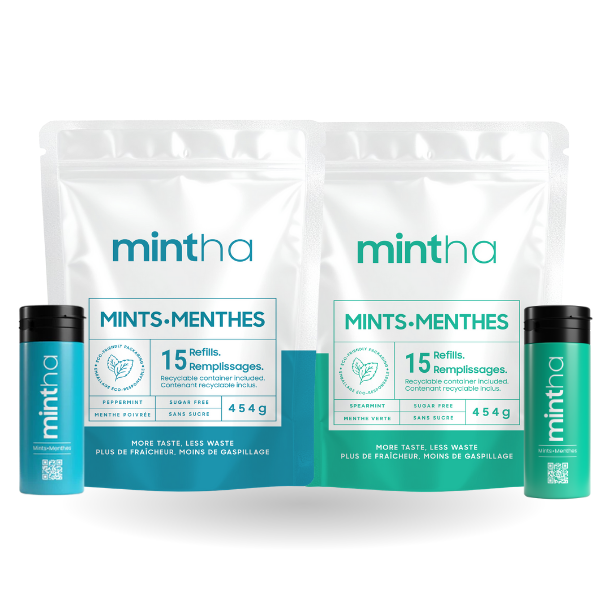 Go green with Mintha! Our Canadian-made, sugar-free Peppermint mints come in a 454g resealable bag with a refillable tube, offering up to 15 refills. Enjoy fresh breath without the waste, delivered right to your door. And we're always SHIPPING FOR FREE!